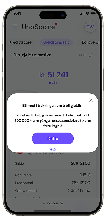 Sjekk gjelden din hos Uno Score og bli med i trekningen om å få den rentebærende kreditt- og forbruksgjelden din nedbetalt med inntil 600 000 kroner! Konkurransen varer frem til midnatt 04. januar, og trekningen skjer påfølgende dag.